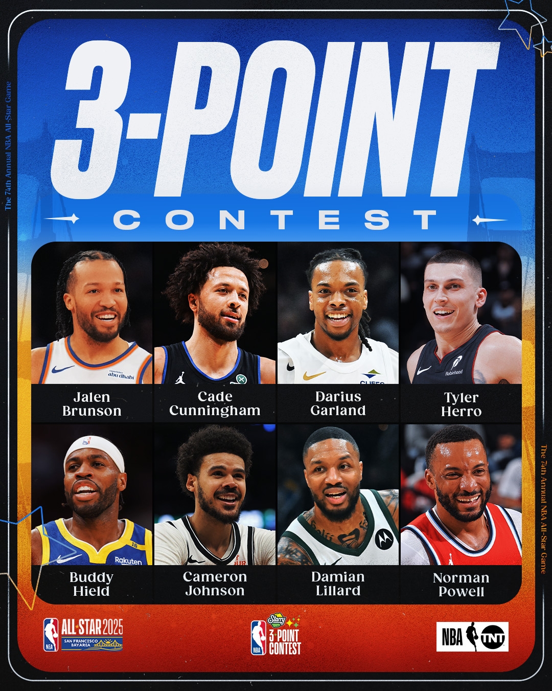 02月16日讯 NBA2025年旧金山全明星周末三分大赛在大通中心进行,参赛球员:布伦森(尼克斯)、凯德-康宁汉姆(活塞)、加兰(骑士)、利拉德(雄鹿)、希尔德(勇士)、卡梅隆-约翰逊(篮网)、希罗(热火)和诺曼-鲍威尔(快船)!