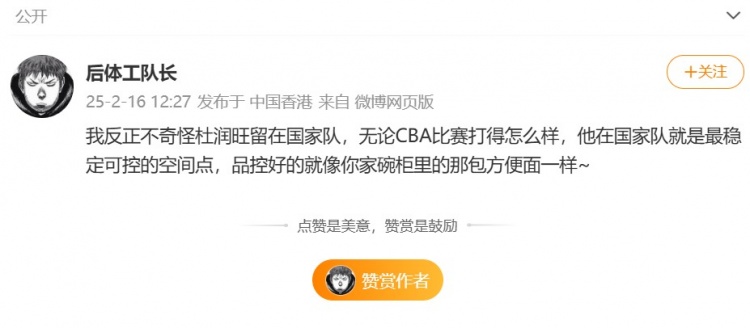 媒体人@后体工队长发微博对此发表看法,他写道:“我反正不奇怪杜润旺留在国家队,无论CBA比赛打得怎么样,他在国家队就是最稳定可控的空间点,品控好的就像你家碗柜里的那包方便面一样~​​”