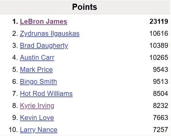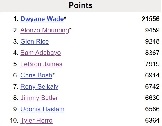 (注:詹姆斯在热火得分排名第五、上图错误)