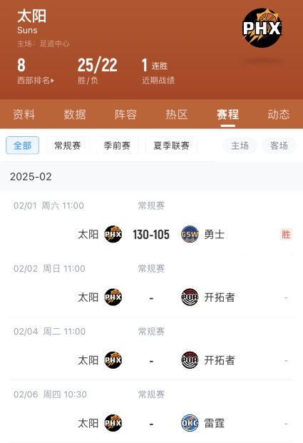 太阳未来3场比赛赛程: