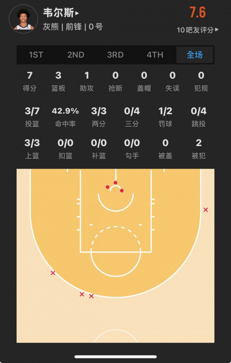 灰熊39号秀 杰伦-韦尔斯 登场16.7分钟