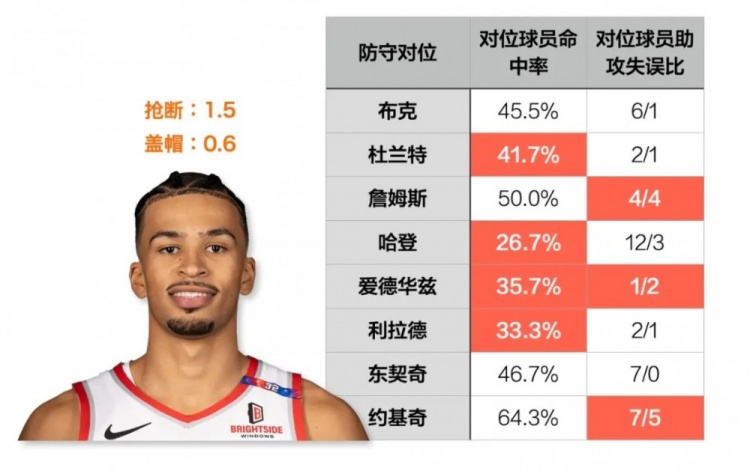 数据显示,卡马拉赛季至今,有59.5%的时间防后卫,30.5%的时间防前锋,防中锋的时间则是达到了10%。