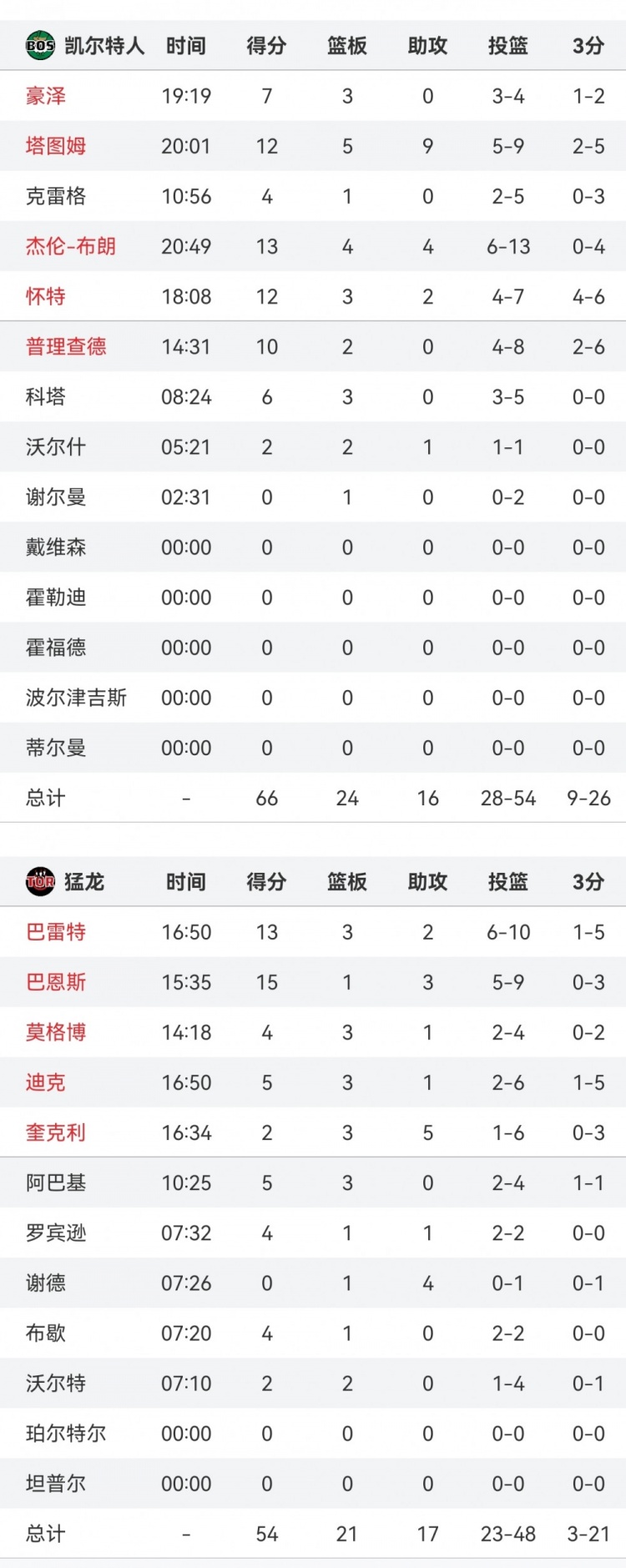 凯尔特人半场66-54领先猛龙12分 全队4人得分上双