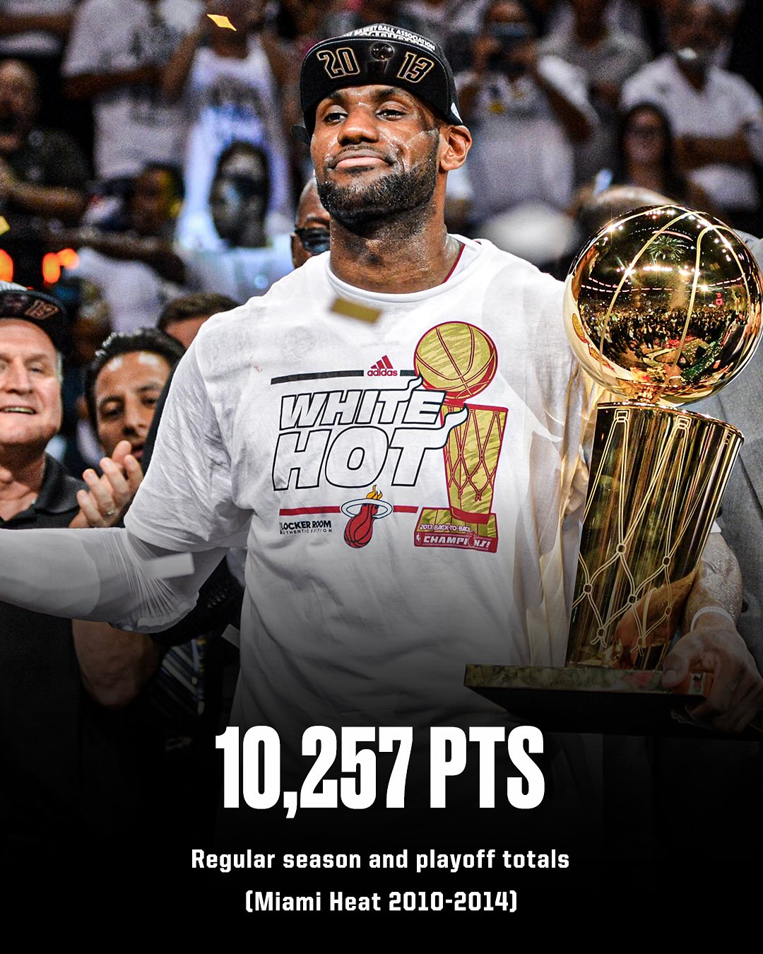 49999已断档领先!詹姆斯职业生涯四队总得分分布 热火时期最少
