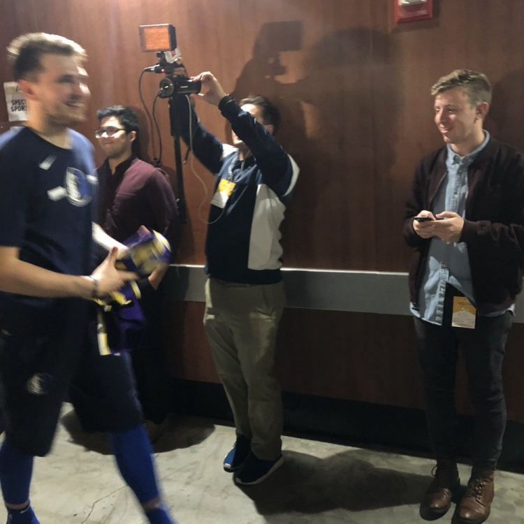 湖记Dave McMenamin更推晒照:“这些模糊的照片拍摄于2018年11月1日,菜鸟赛季的东契奇首次打完湖人后索要詹姆斯球衣,随后东契奇前往湖人更衣室从保安手中拿到了球衣。”