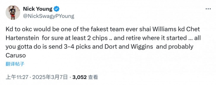 3月7日讯 今日前NBA球员尼克-杨发推谈到了杜兰特。