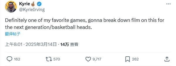 美媒写道:“5年前的今天(2020年1月31日),欧文31分钟砍下54分,仅投丢了4个球。”欧文则回复道:“这绝对是我最喜欢的比赛之一,我会为下一代(球员)/球迷们解析这场比赛。”