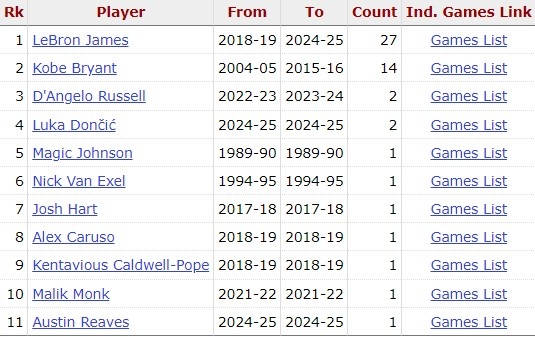 湖人队史30+5+5+5三分场次:詹姆斯27 科比14 东契奇&拉塞尔2
