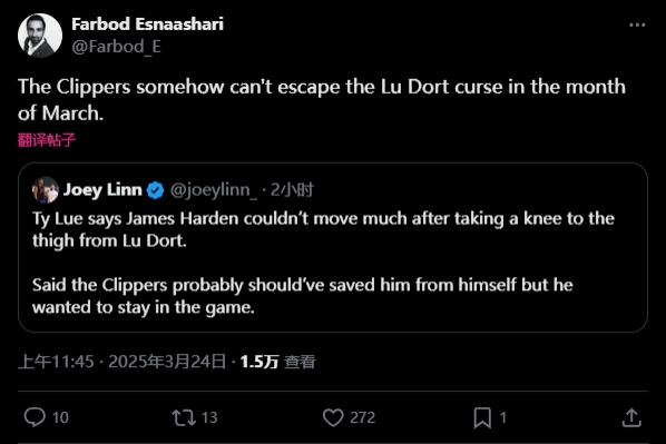 快船队记Farbod Esnaashari发推表示:“快船在三月份似乎无法摆脱卢-多特的魔咒。”