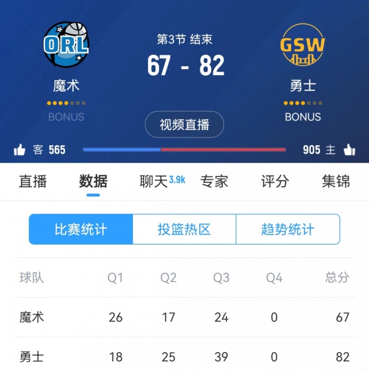 第三节,勇士火力全开,攻防两端压制对手,单节39-24净胜魔术15分,而上半场勇士仅得到43分。