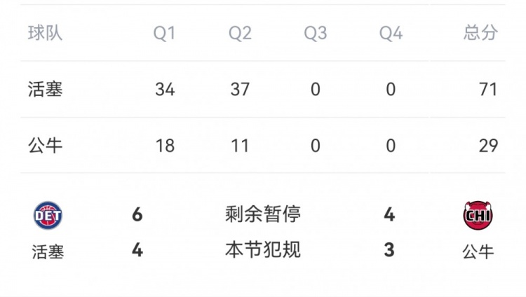 2月12日讯 NBA常规赛,活塞半场71-29领先公牛。