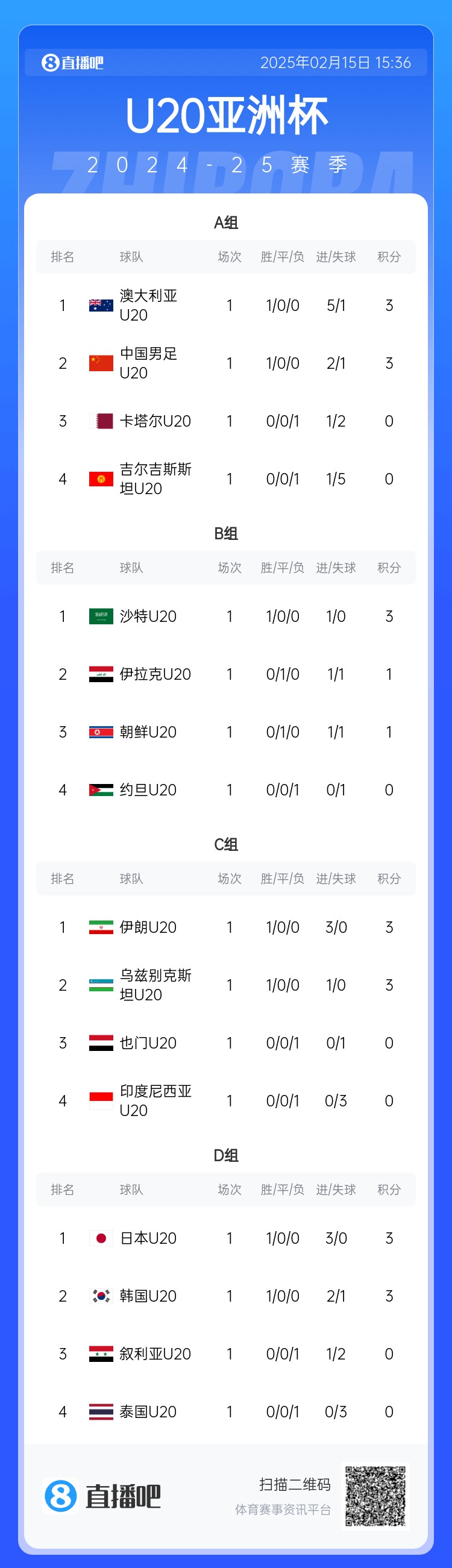 A组首轮比赛中,U20国足2-1击败卡塔尔U20,暂列小组第二;吉尔吉斯斯坦U20则以1-5惨败于澳大利亚U20,暂列小组垫底。