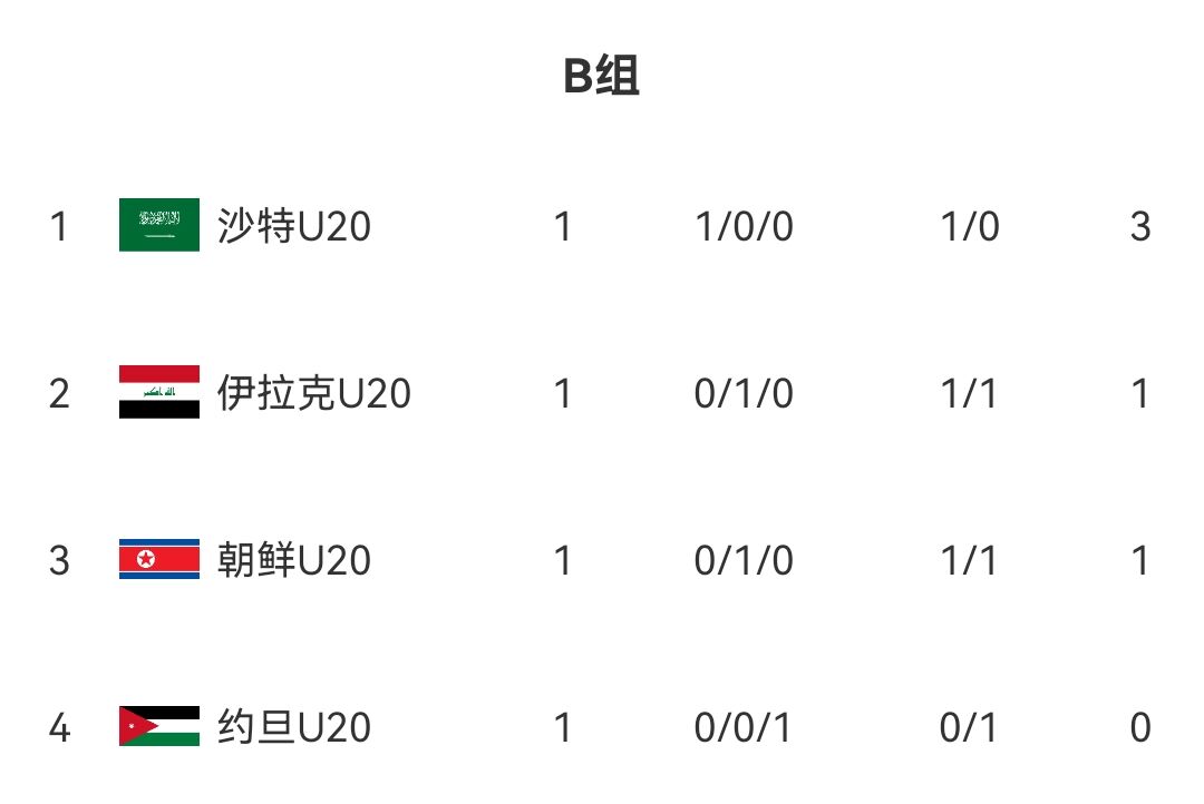 在8强战中,国足所在的A组前二将与B组前二交叉对阵,目前B组仅进行了一轮比赛,沙特U20暂居第一。