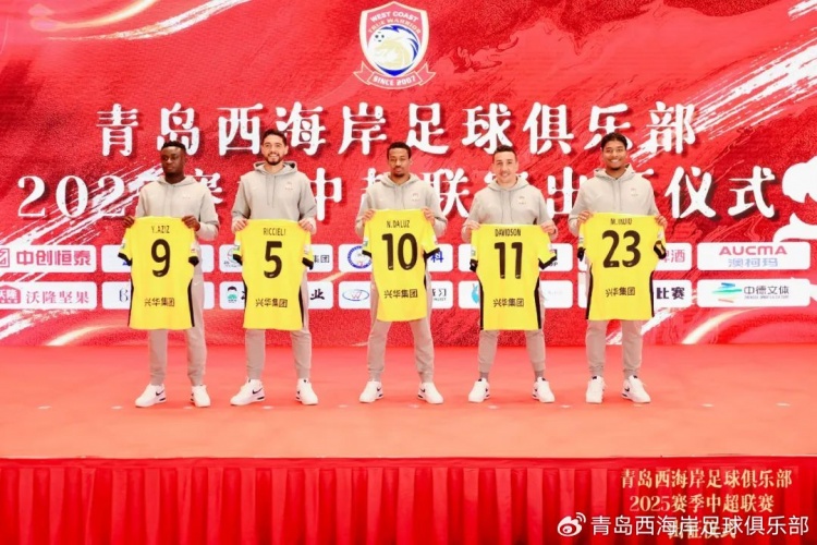 2月16日讯 据青岛西海岸俱乐部官博报道,今天下午,青岛西海岸足球俱乐部举行了2025赛季中超联赛出征仪式,包括里切利、阿齐兹、戴维森在内的新赛季球队5名外援集体登场亮相。