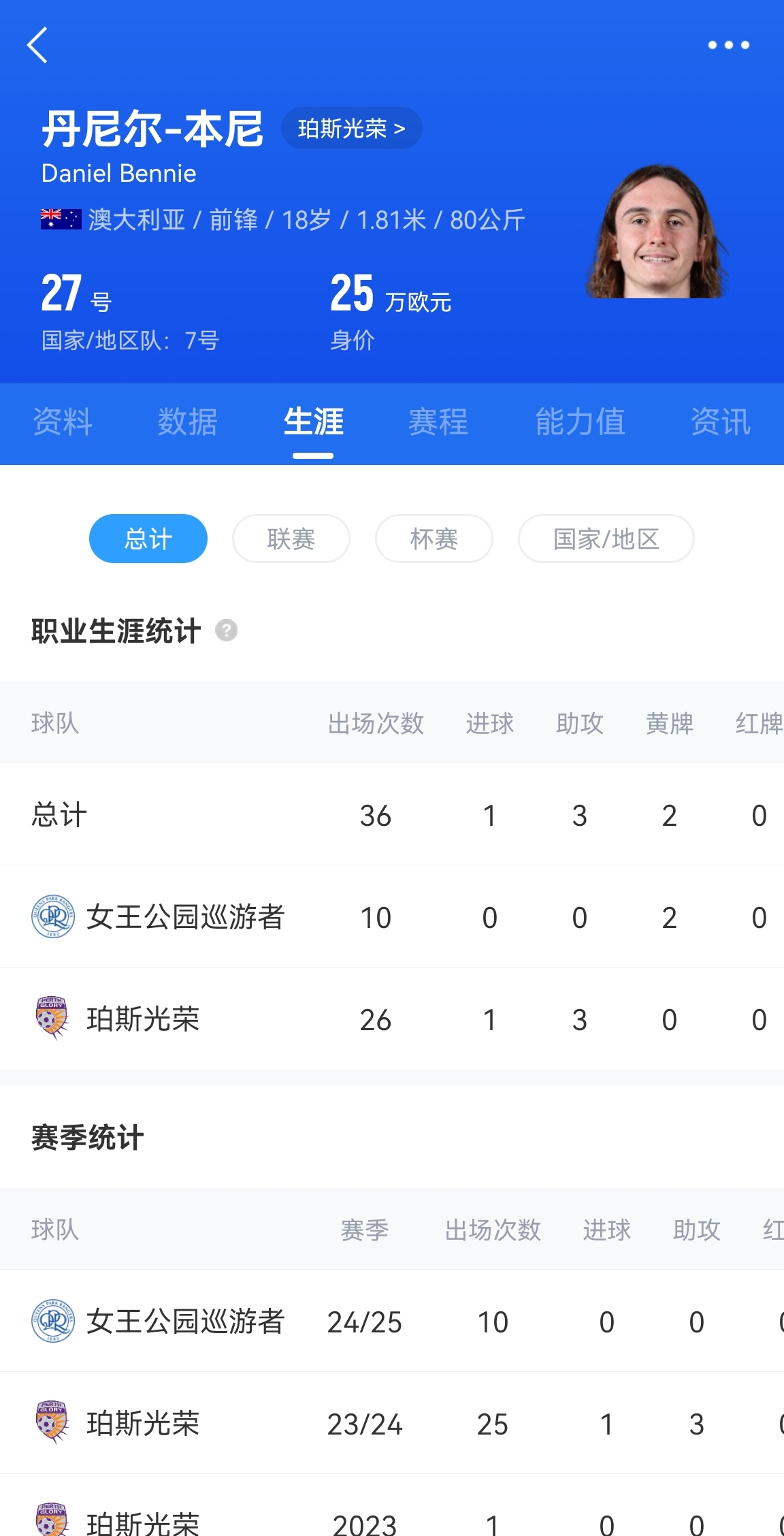 18岁的本尼上赛季在澳超珀斯光荣出场25次,去年夏天以29.7万欧元的转会费加盟英冠女王公园巡游者,本赛季在英冠出场9次。