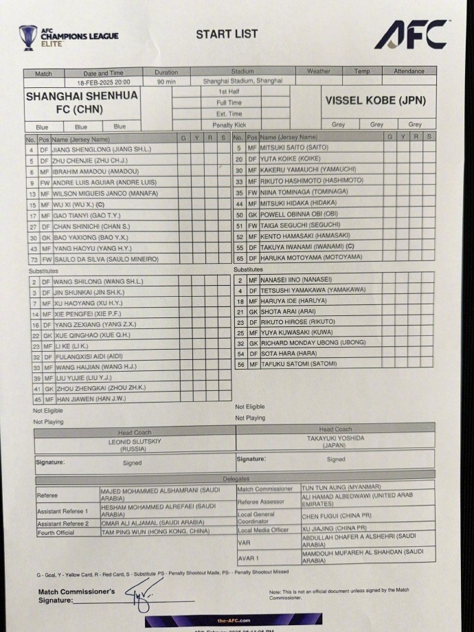 2024/25亚冠精英联赛第8轮 上海申花vs神户胜利船 首发名单