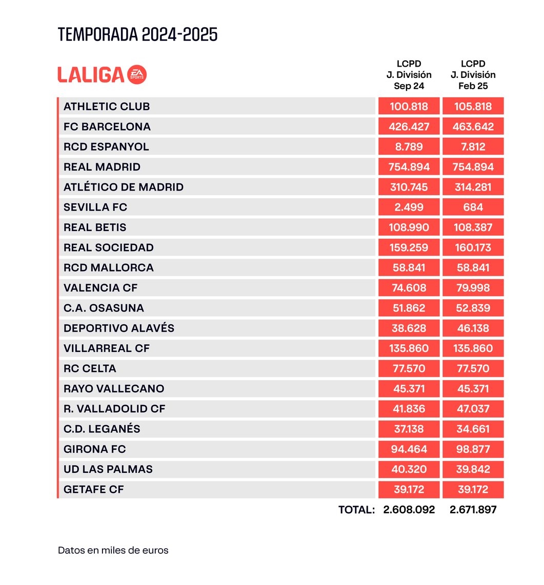 西甲官方在冬窗后更新了更新的各队工资帽,皇马7.55亿欧居首,巴萨4.64亿欧第二。