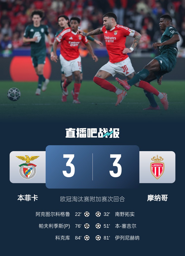 本菲卡3-3总比分4-3淘汰摩纳哥晋级16强。