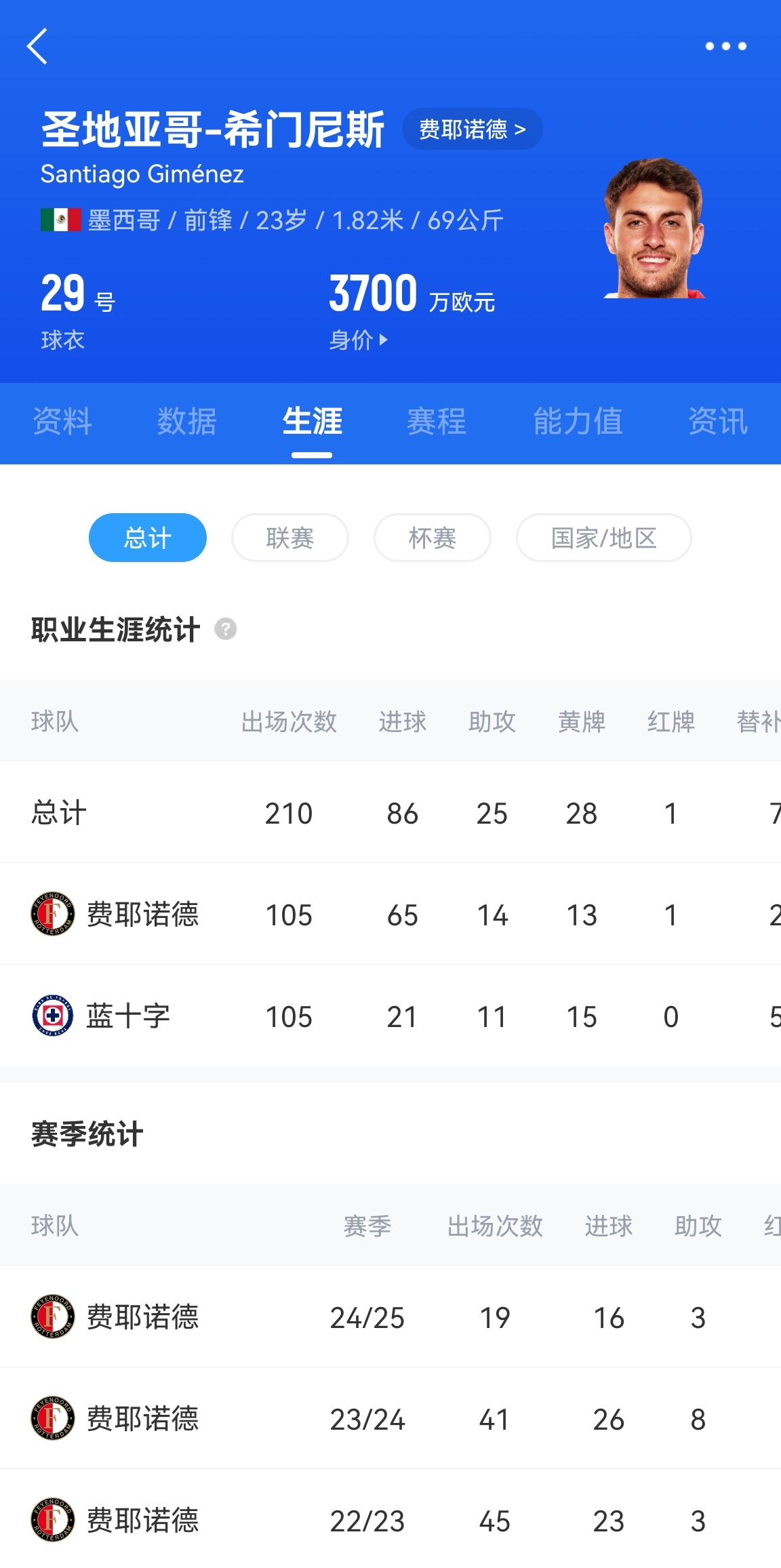 希门尼斯现年23岁,墨西哥前锋,2022年600万欧元从墨西哥蓝十字加盟费耶诺德,截至目前共为费耶诺德出战105次打入65球,其中本赛季出场19次,打进16球并有3次助攻。目前他的德转身价为3700万欧元。