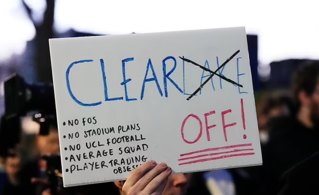 还有的球迷的横幅上写着:“伯利、埃格巴利、清湖资本离开切尔西,你们在摧毁我们的俱乐部!”