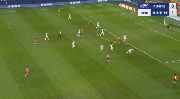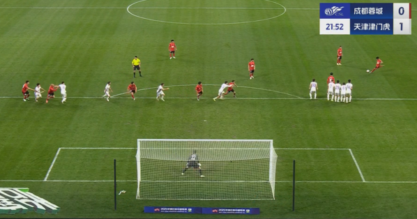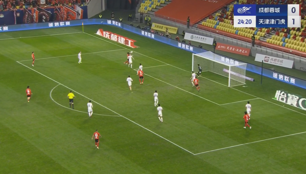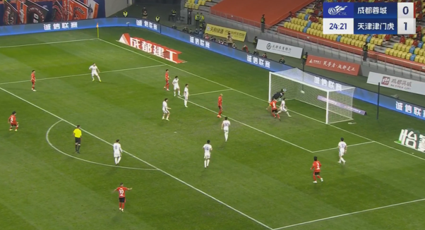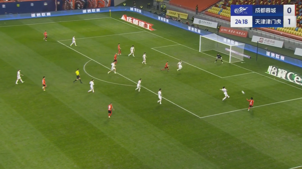 第25分钟,蓉城扳平比分,胡荷韬右路送出精准传中,韦世豪头球吊射顶入球门远角,蓉城1-1津门虎。