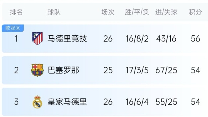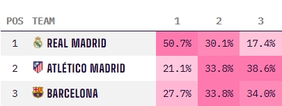 皇马最新西甲夺冠概率28.1%,西甲三强中最低