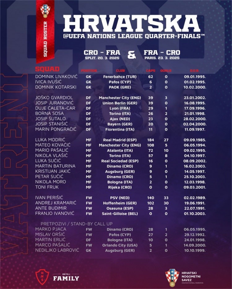 3月国际比赛日,克罗地亚将在欧国联比赛中两回合对阵法国队。