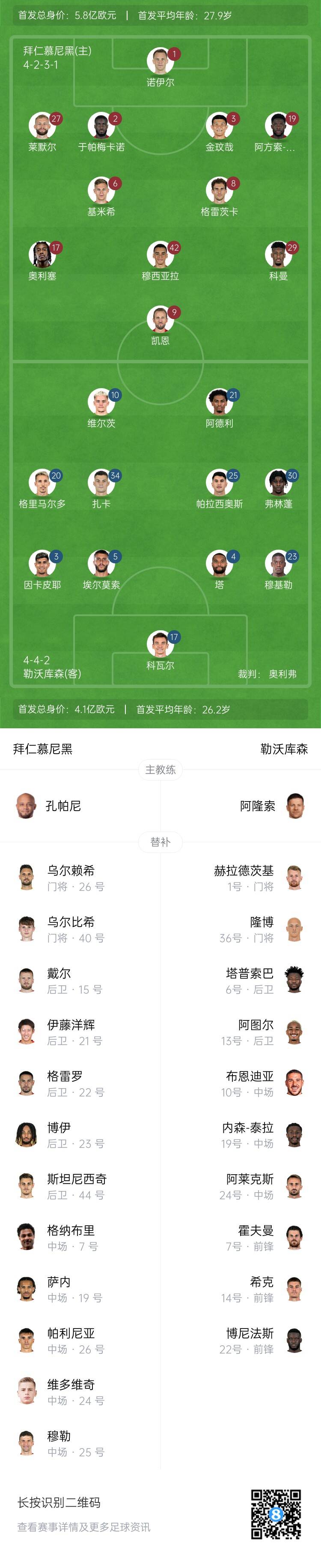 拜仁首发:1-诺伊尔、27-莱默尔、2-于帕梅卡诺、3-金玟哉、19-阿方索-戴维斯、6-基米希、8-格雷茨卡、42-穆西亚拉、11-科曼、17-奥利塞、9-凯恩