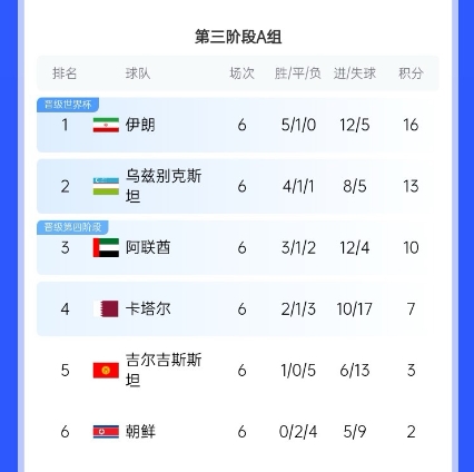 目前在世预赛亚洲区A组积分榜上,阿联酋6轮3胜1平2负排在第三,距离第二的乌兹别克斯坦差3分。