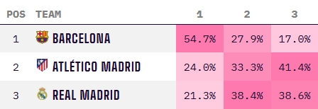 巴萨:54.7%;马竞:24%;皇马21.3%