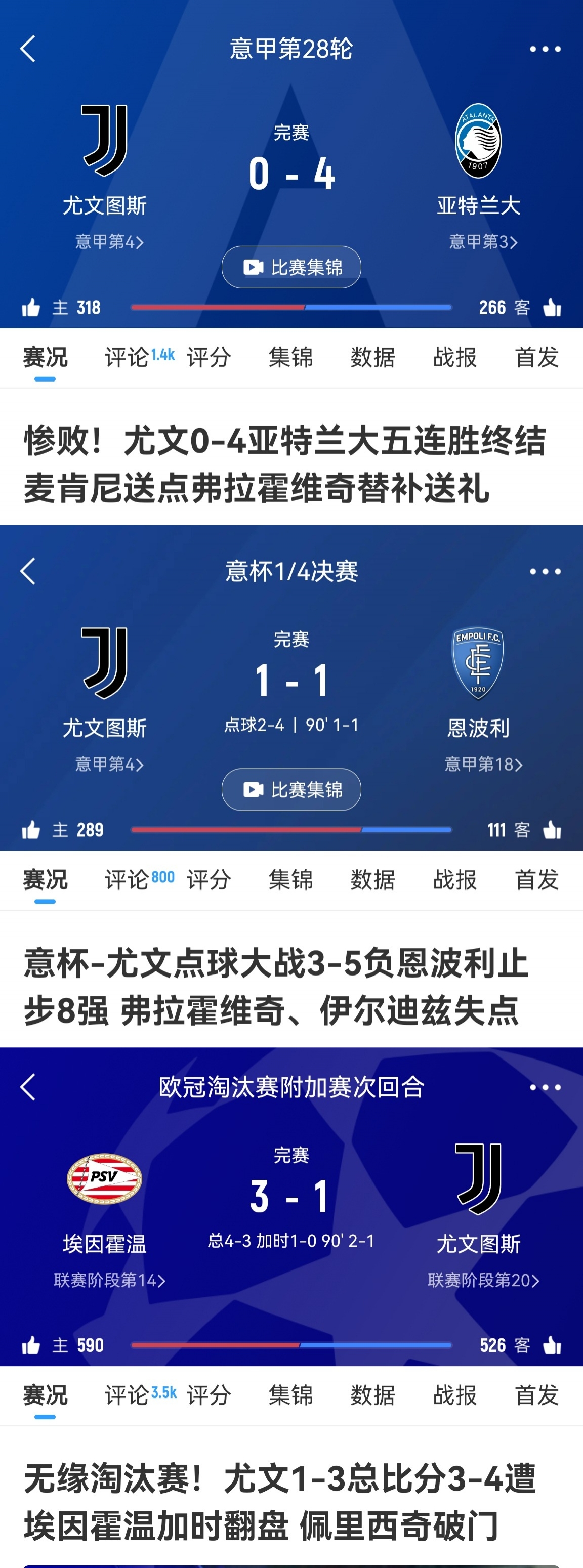 意杯赛场,尤文1/4决赛点球大战不敌保级队恩波利。欧冠赛场,球队1比3被荷甲第2埃因霍温加时赛翻盘。