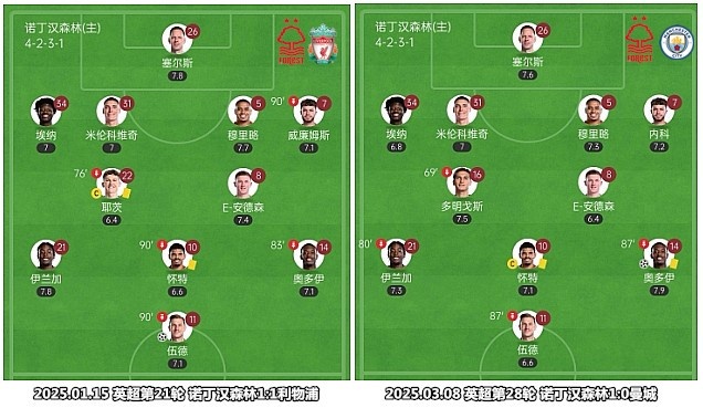 进入下半程以来,诺丁汉森林在对阵利物浦、阿森纳和曼城时取得1胜2平的战绩,本赛季9次面对Big6球队拿到15分,黑马成色不减,争四希望大增。在莱斯特城创造奇迹的赛季中,拉涅利的弟子们面对Big6时拿到19分,纽卡斯尔和阿斯顿维拉在过去两个赛季打破了Big6对欧冠资格的垄断,他们对垒六强时分别拿下16分和17分,努诺的球队面对精锐时也是战力十足,他们还有3场比赛的机会去刷新纪录。
