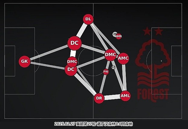穆里略和米伦科维奇配合默契,埃兰加和奥多伊可以深度退守保护边后卫,克里斯-伍德总是在不停干扰对手的传递,吉布斯-怀特甚至能够来到中卫身前扮演清道夫……诺丁汉森林拥有正面防守能力出众的中卫组合,他们身边聚集了多名柔韧性出众、脚下缠斗能力强且愿意防守的攻击手。努诺-桑托的球队防守时颇具拉丁风味,依靠错落有致的三线结构堵塞禁区空间,就是他们的招牌动作。