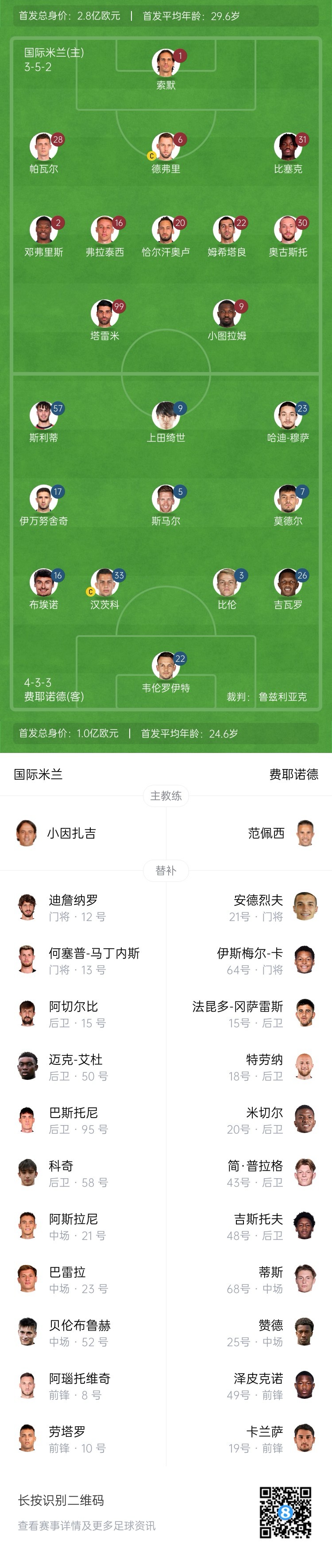 3月12日讯 欧冠16强次回合,国米主场迎战费耶诺德比赛即将打响。赛前首发出炉。