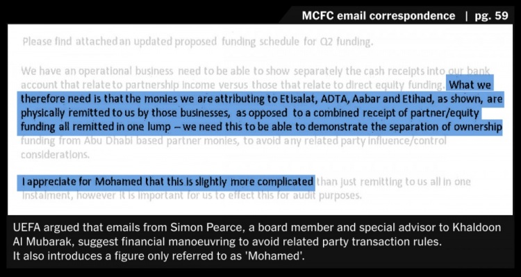 欧足联表示,西蒙-皮尔斯的邮件中表明,为规避关联交易规则,进行了一些财务操作。西蒙-皮尔斯是曼城董事会成员,也是穆巴拉克的特别顾问。邮件中还引入了一个叫做“穆罕默德”的代称。