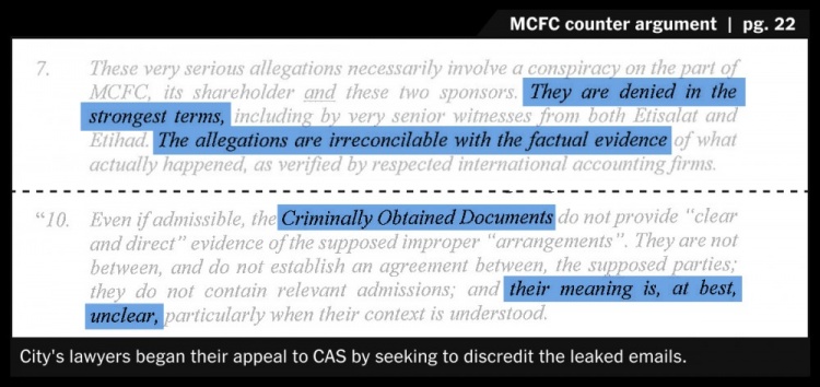 曼城向CAS提出了上诉,声称他们不必对泄露的邮件进行身份验证,并认为它们超出了审查小组的需要。