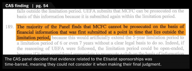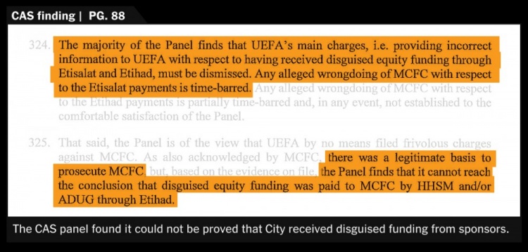 CAS三人小组中的两人驳回了曼城通过伊蒂哈德航空和阿联酋电信收到变相付款(或者说是“假赞助”)的主要指控,认为所有与阿联酋航空付款有关的“证据”都已经超过时效,伊蒂哈德航空的付款也是如此。并且无论如何,提供错误信息的指控尚未成立。