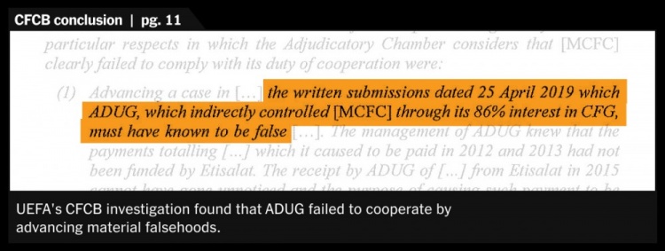 CFCB调查发现,曼苏尔通过其在城市集团的股份间接控制了曼城,且未能配合调查,解释CFCB所怀疑的“虚假信息”。