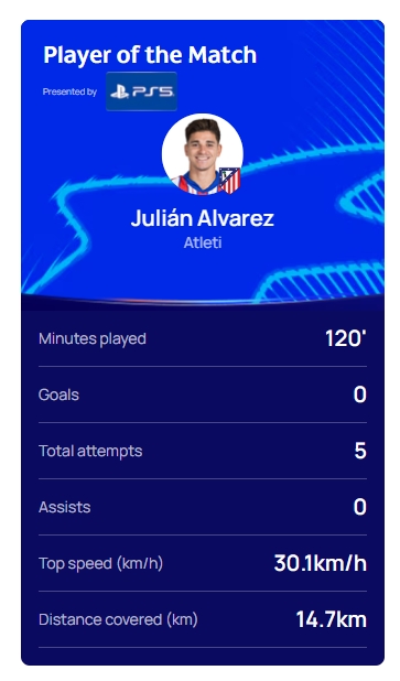 点球违例被判无效!官方:阿尔瓦雷斯当选马竞vs皇马全场最佳