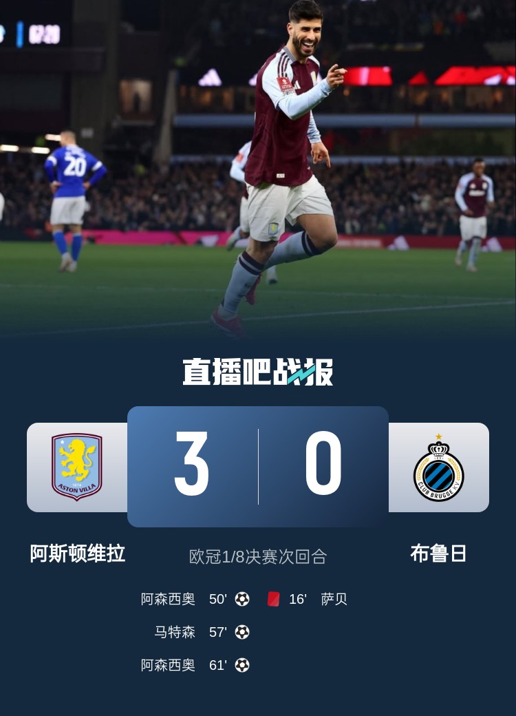 欧冠1/8决赛次回合,维拉3-0击败布鲁日,总比分6-1晋级欧冠8强。上半场,大马丁精准长传找到拉什福德,后者制造直红;下半场,阿森西奥替补登场双响,另有一次中柱,拉什福德贡献1助攻,马特森打进1球。