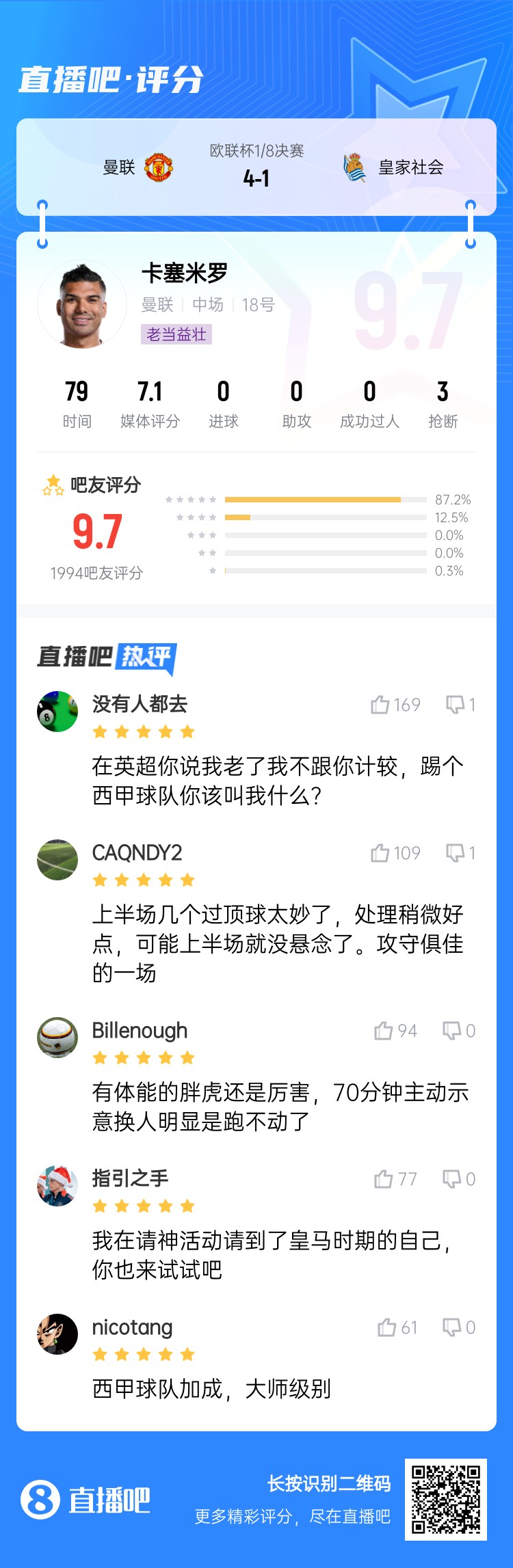 欧联1/8决赛次回合,曼联4-1战胜皇家社会。卡塞米罗本场比赛首发出战79分钟,表现出色,赛后吧友给他打出9.7分的高分。