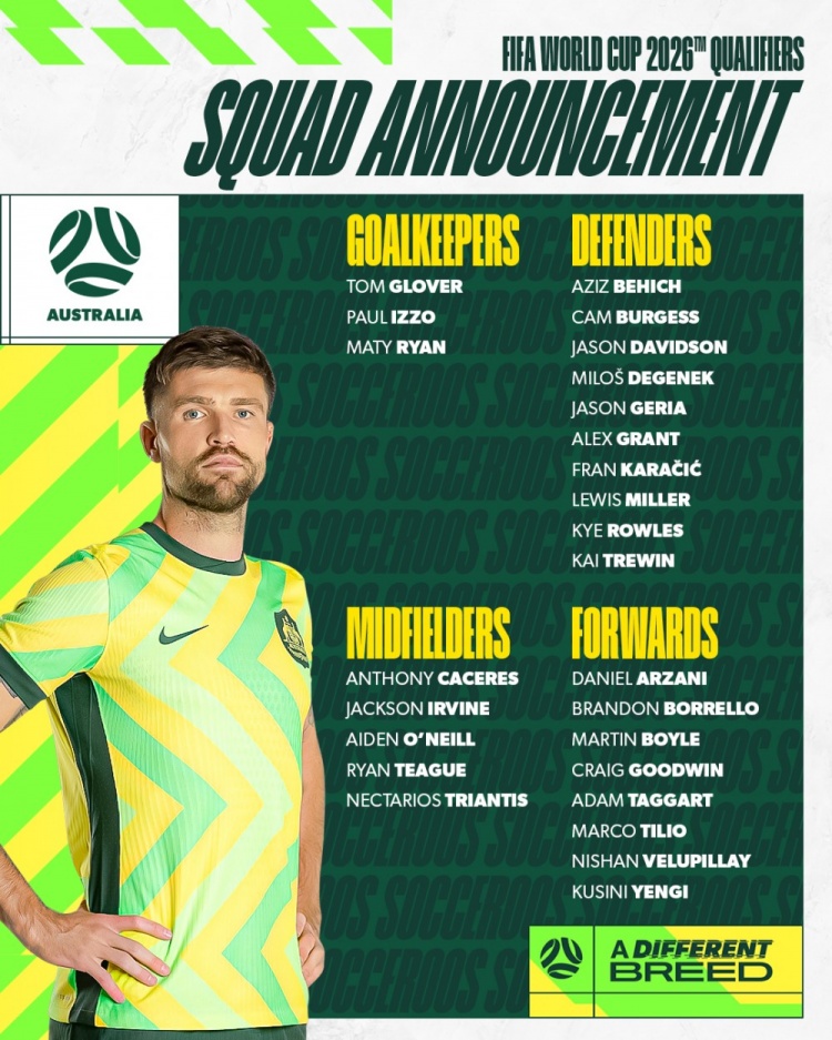 【相关】澳大利亚队世预赛名单:“人民球王”古德温领衔,3月25号对国足