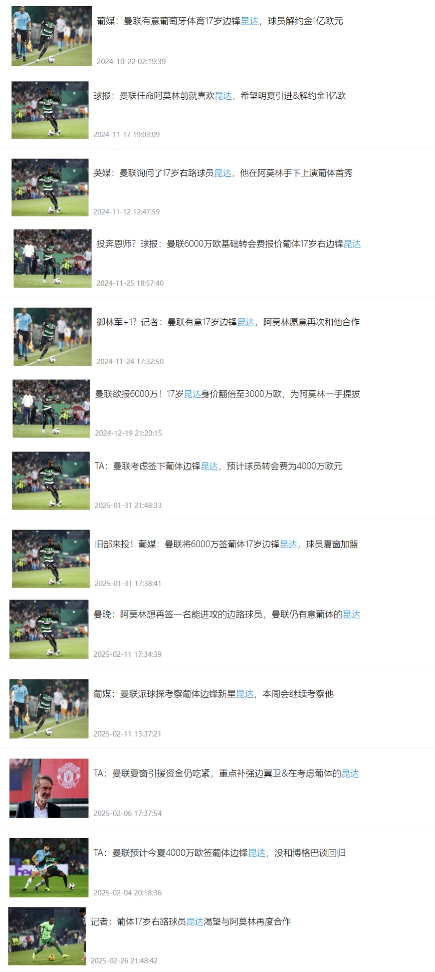 昆达2019年加盟葡萄牙体育青训,去年夏天被阿莫林提拔至葡体一线队。从去年10月开始,就持续有曼联打算签下昆达的传闻。