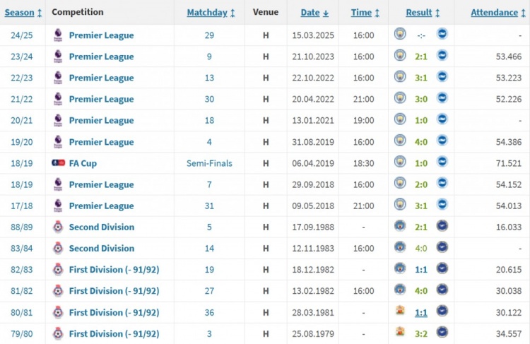 12胜2平,曼城历史上各项赛事主场对阵布莱顿未尝败绩