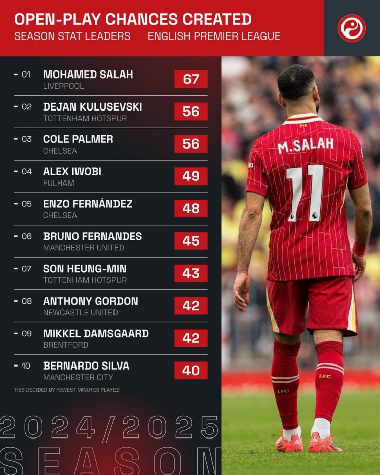 本赛季英超运动战创造机会榜:萨拉赫居首,帕尔默、B费、B席在列