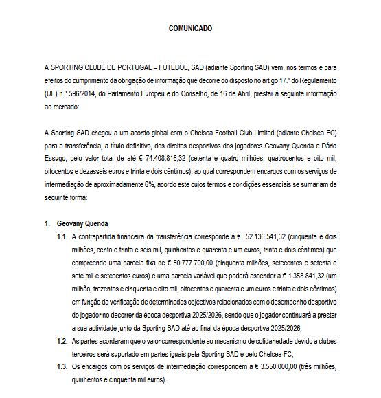 葡体与切尔西就球员昆达和埃苏戈的永久转会达成全面协议,总金额为74408816.32欧元(约7441万欧),其中包括约6%的中介服务费用。