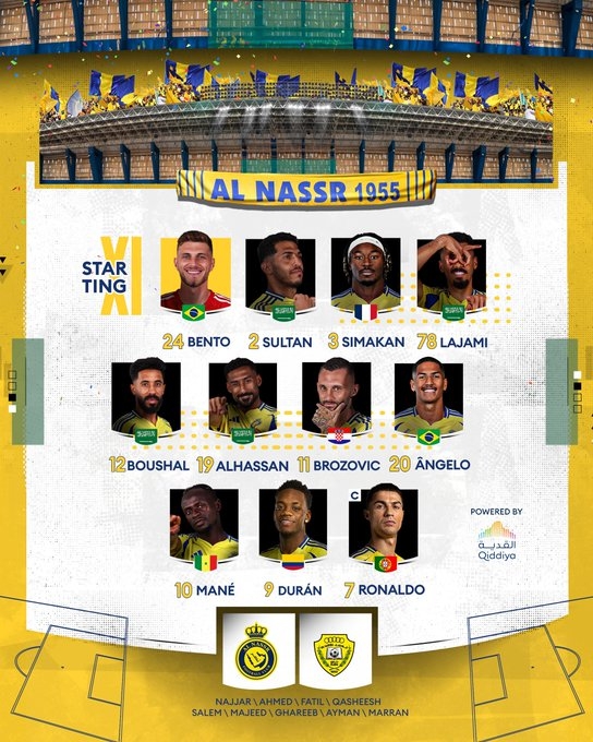 利雅得胜利首发:24-本托、2-哈纳姆、3-西马坎、78-奥贾米、12-纳瓦夫、19-哈桑、11-布罗佐维奇、20-安吉洛、10-马内、9-杜兰、7-C罗