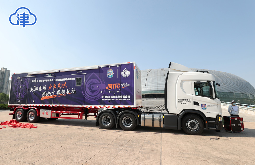 据悉,这是天津首台移动方舱CT车。津门虎队主场进行比赛时,水滴影像中心均会派遣这台移动方舱CT车随队出征。