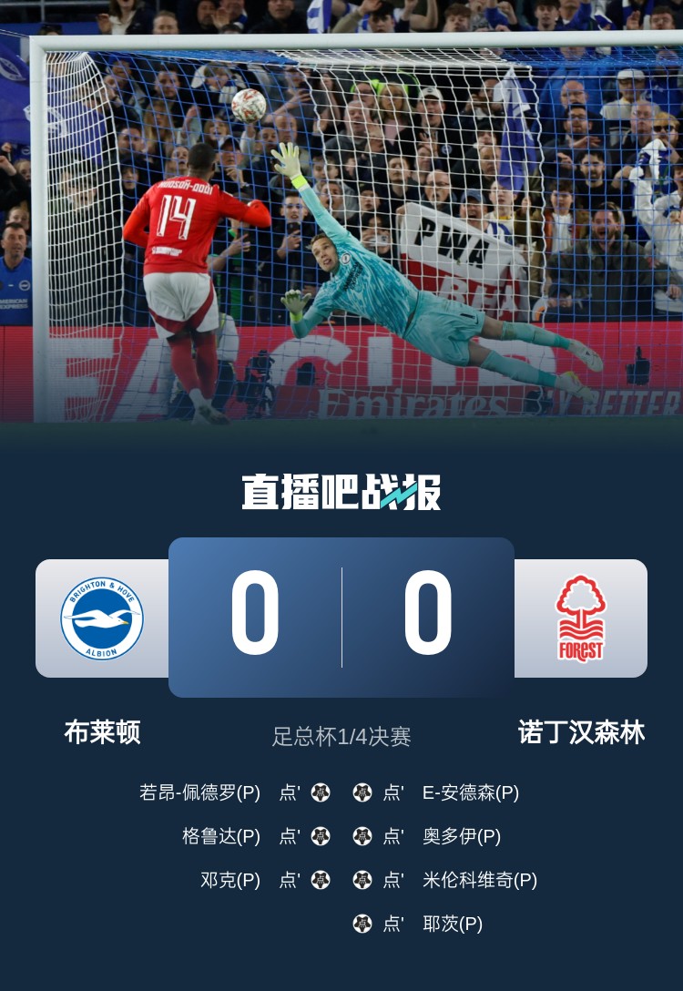足总杯1/4决赛,布莱顿点球大战3-4诺丁汉森林遭淘汰。上半场,埃斯图皮尼远射造险;下半场,主裁判判罚三笘薰禁区内犯规但VAR取消点球;加时赛,佩德罗破门但助攻的埃斯图皮尼安越位;点球大战,辛谢尔伍德、戈麦斯主罚被扑出,威廉姆斯爆射打飞。