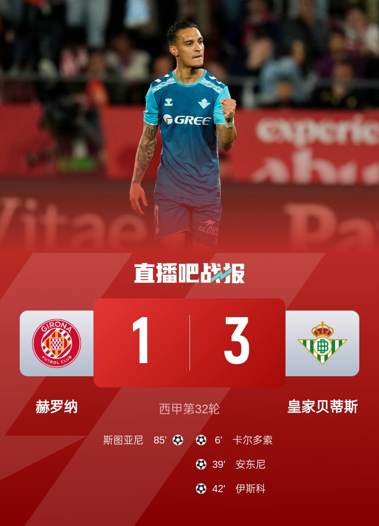 先赛距欧冠区1分!贝蒂斯3-1赫罗纳 安东尼逆足凌空破门+失单刀